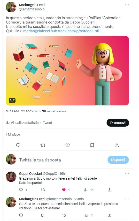La settimana scorsa ho dato risonanza al post che avevo scritto, twittandolo. L’indomani mattina aprendo Twitter ho trovato questa piacevolissima sorpresa: