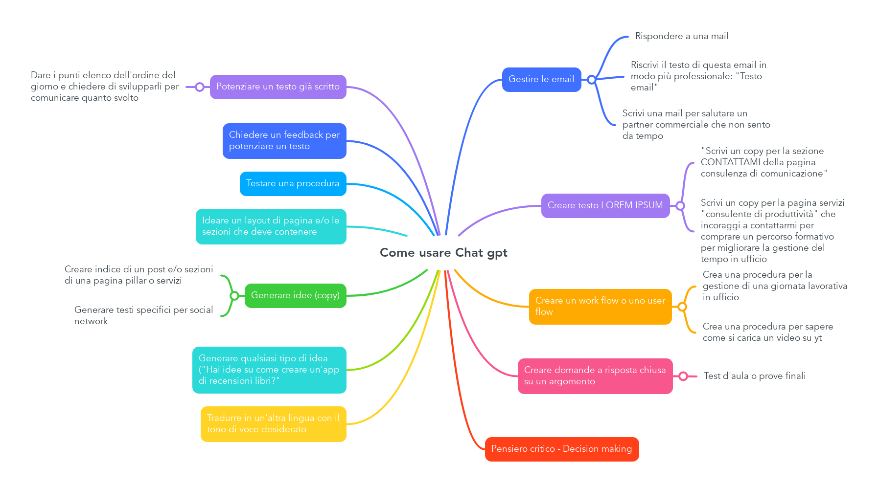 Non usarlo come un’enciclopedia, usalo per la sua capacità di calcolo. Ricordalo quando ti darà risposte imprecise in quanto ad attendibilità. Non è detto che ne sappia più di te, ma sicuramente è più veloce di te e di me a creare quello che vedi nella mappa mentale che ti ho condiviso.